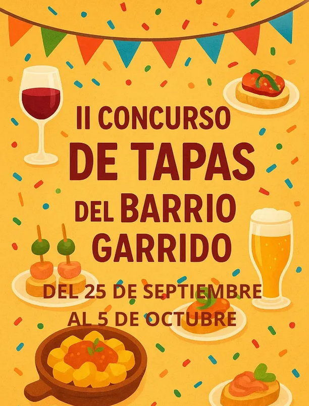 Leer más: II CONCURSO DE TAPAS DE GARRIDO 2025¡Vuelve el sabor que nos une! Del 25 de septiembre al 5 de octubre de 2025 celebramos la segunda edición de nuestro concurso de tapas. Once bares del barrio se han puesto el delantal para crear bocados con mucha personalidad. Tu misión: probar, disfrutar y votar tu favorito. Bares participantes y tapas ¿Cómo participar? 🗳️…